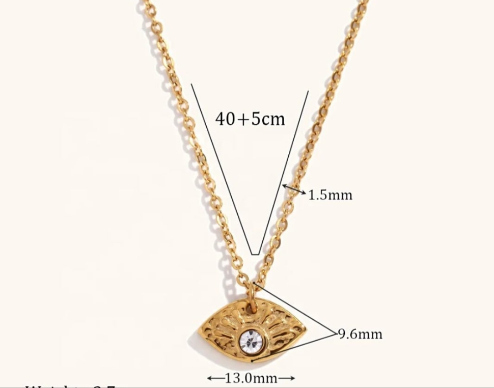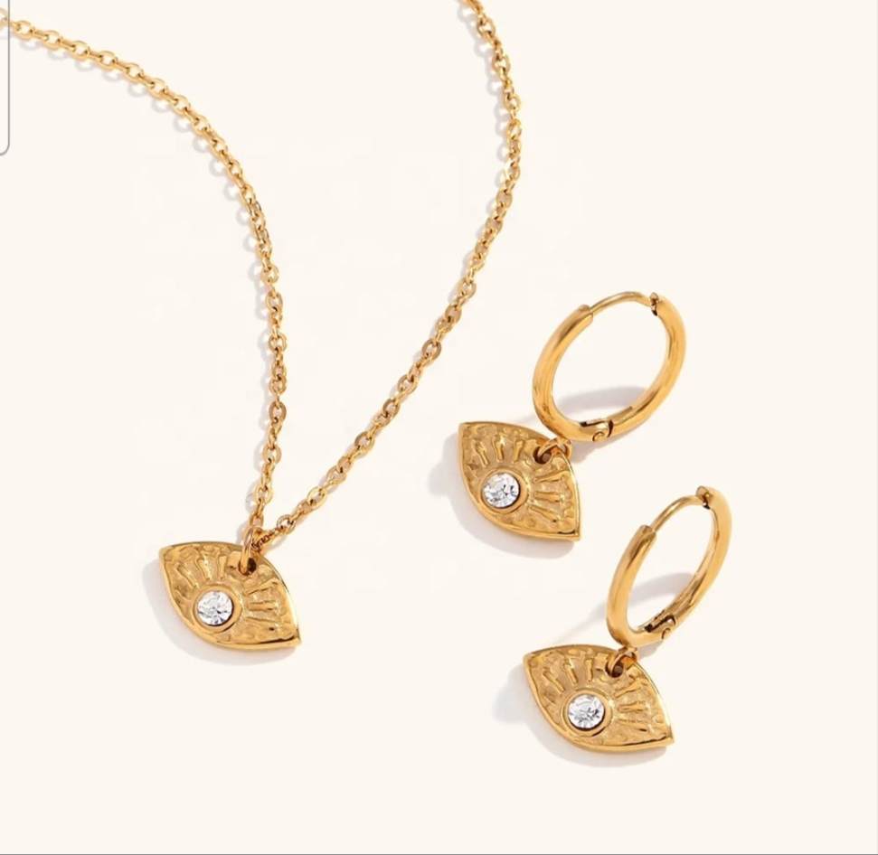Gold eye charm jewellery set. Available as a necklace or hoop earrings. Sold separately.