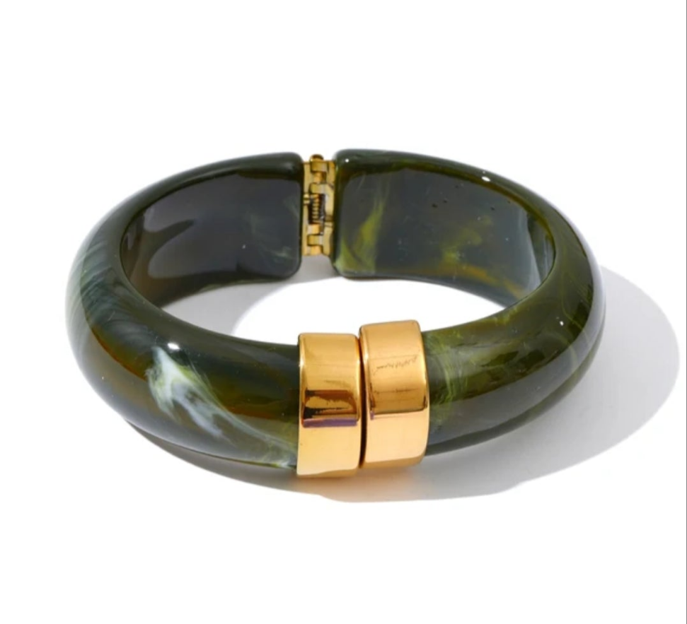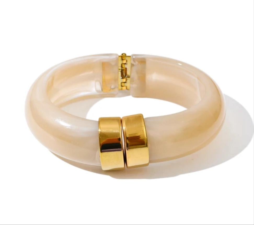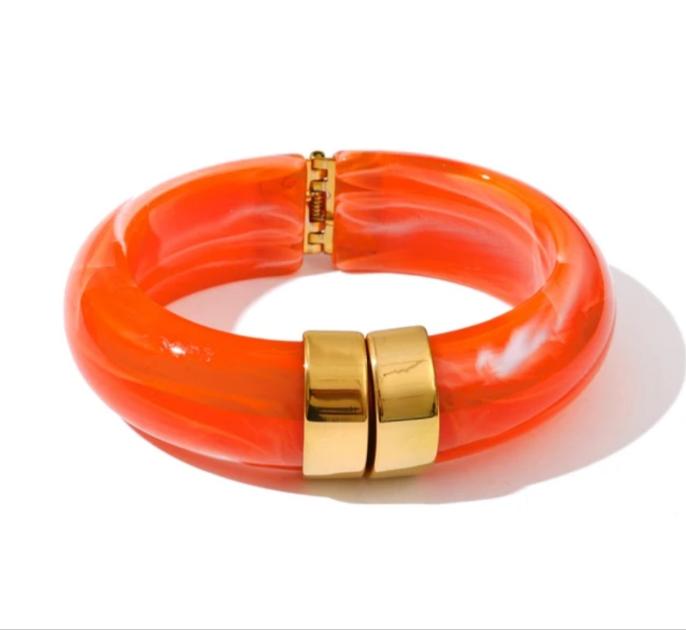 Acrylic chunky bracelet bangle with gold closure. Available in black, orange, cream, tortoiseshell and dark green.