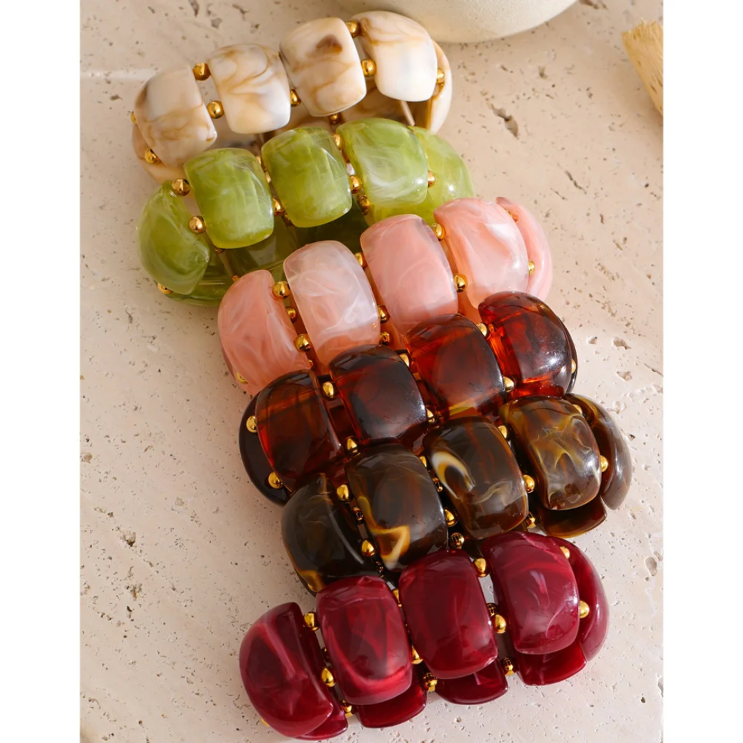 Chunky resin stretch bracelets. Available in green, burgundy, tortoiseshell, cream or brown.