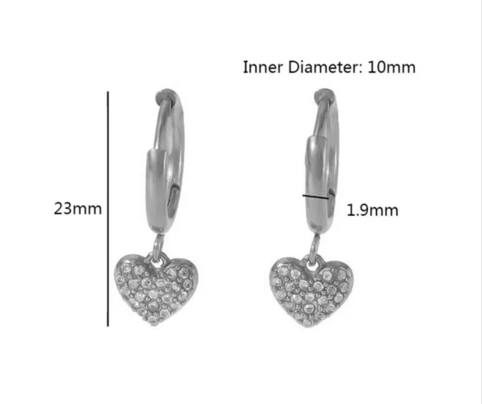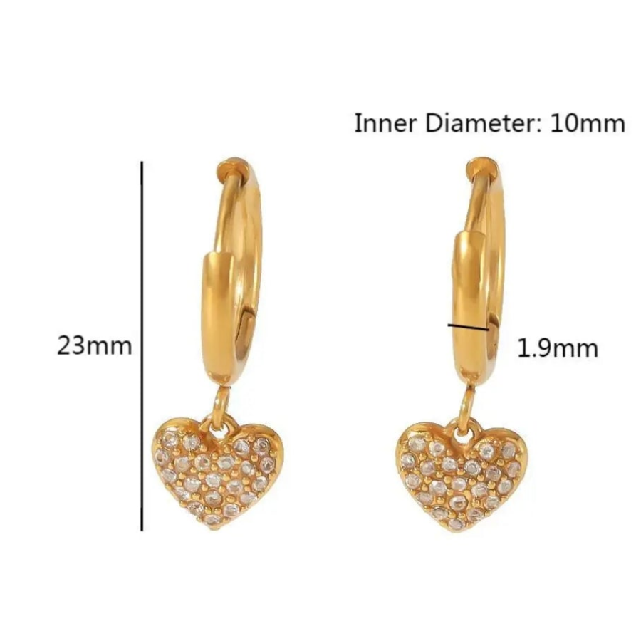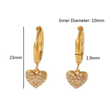 Small huggie hoop earrings with sparkly heart charms. Available in gold or silver.