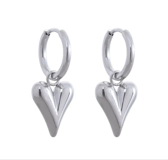 Heart pendant charm hoop earrings. Available in gold or silver.