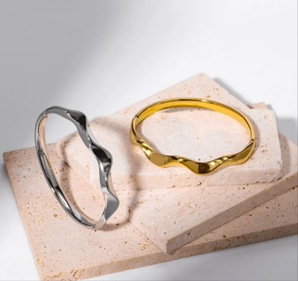 Twisted hinged bracelet bangle. Available in gold or silver.
