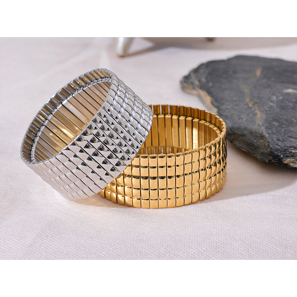 Wide stretch bracelet. Stretch to fit most wrist sizes. Available in gold or silver.
